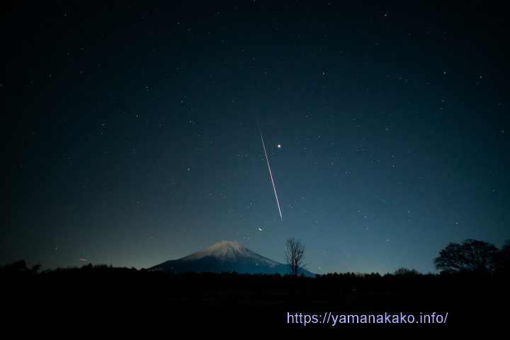 昨夜は双子座流星群の極大日だったので、20時半頃から22時半頃までの約2時間まで、カメラを富士山方向にセットしてそのまま放置し、空を眺めてみました。肉眼では双子座付近でよく流れていましたが、富士山方向では約300枚のうち流星が写っていたのはこれも含め2枚だけでした。