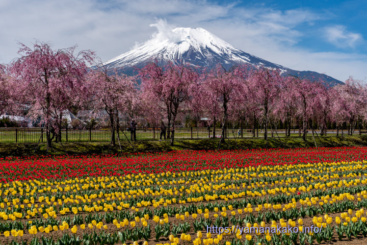 チューリップと八重紅しだれ桜と昨日、チューリップと八重紅しだれ桜の様子を投稿しましたが、今日は富士山も見えていたので、もう一度行ってきました。桜は昨日よリだいぶ開花が進み、きょうはかなり暖かなので、週末まで持たないかもしれません。