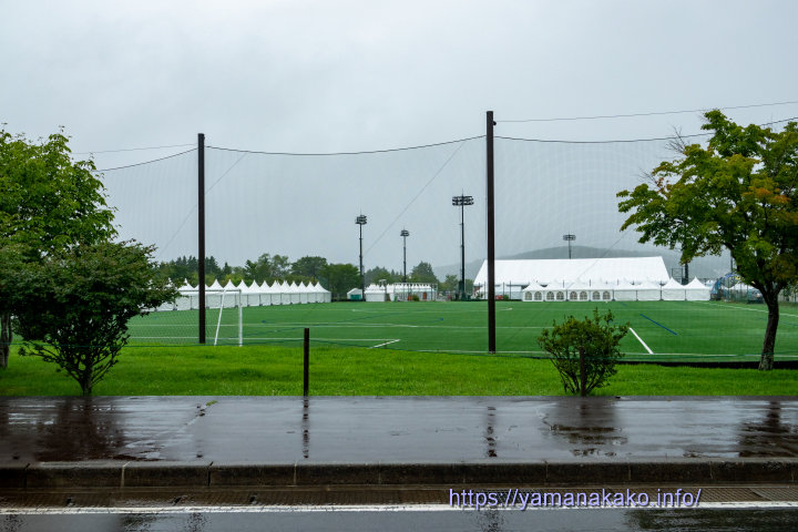 今朝のきららの様子 8月最後の週末恒例となったSWEET LOVE SHOWERが、明後日(金曜日)から開催されます。山中湖交流プラザきららで先週から会場の準備が行われており、すでにたくさんのテントが張られ、写真のテントの向こう側にはレイクサイドステージもできあがってきていました。