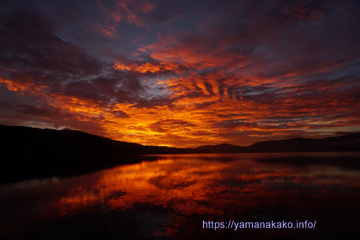 空も湖も染まる朝焼け今朝は雲が多めで富士山は見え隠れしていましたが、東の空はその雲がいい色に染まって、湖も空も赤く染まる朝焼けが見られました。こんな日は、富士山も赤くなることが多いので、慌てて見えるところに移動してみましたがちょっとしか見えませんでした。