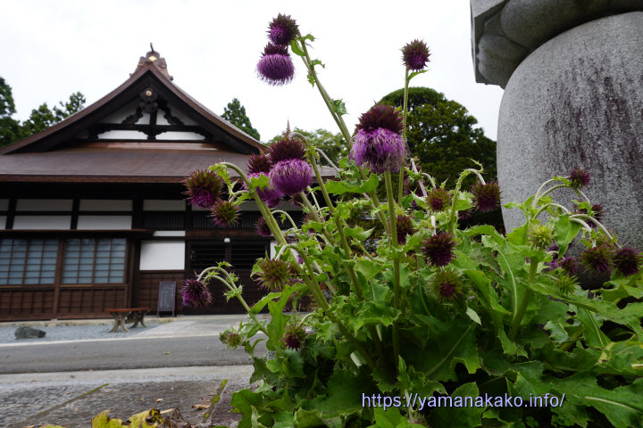 寿徳寺のフジアザミ寿徳寺のフジアザミは、毎年、お彼岸の頃に満開となりますが、この株はまだちょっと早いようで咲き始めといった感じです。今年は改装工事を行っていたためか、花の株が少なめに感じました。