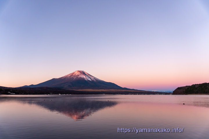 ビーナスベルトがきれい今朝は風もなく、昨日一昨日と湖を覆っていた霧もなく、静かな朝で湖畔からきれいな富士山が見られました。富士山に日が当たり始める頃は、南アルプス方向のビーナスベルトと地球影のグラーデーションがとてもきれいでした。