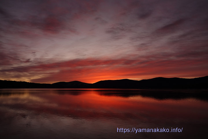 23年09〜12月 朝焼けがきれい 2023年12月18日 山中湖人 コメントする 朝焼けの山中湖今朝は朝焼けがきれいで、空も湖も赤く染まりました。こんな日は紅富士が見られる日もあるのですが、今日は思いのほか雲が厚かったようで、富士山はほんの少し紅く染まった程度でした。 今朝の最低気温は-8.3度で今シーズン一番の冷え込みとなり、やっとプラス気温となったところです。一昨日の16日は12月としては観測史上最高の気温21.1度を記録したばかりなのに、今朝はこの冷え込みで気温差も30度近くで、服装や水回りなど対応が大変です。でも、今日のこの気温がいつもの12月ぐらいかと思います。 午前10時の状況 気温:0度 天候:晴れ 道路状況:山中湖周辺道路に凍結はありません Tweet Check Share on Tumblr