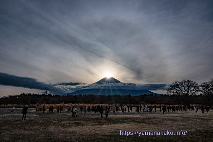 光輪と後光で神々しい富士山昨日のダイヤモンド富士は薄雲で光芒は少なく、ダイヤモンド富士という感じではありませんでしたが、後光が差し光輪(日暈、ハロ)が見られ、神々しい感じでした。昨日はバスも来ていて多くの見物客も訪れていました。