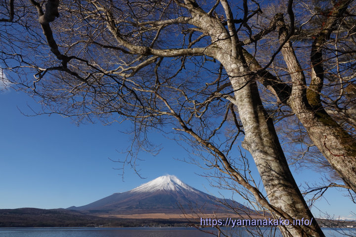 葉のない木の下から望む富士山