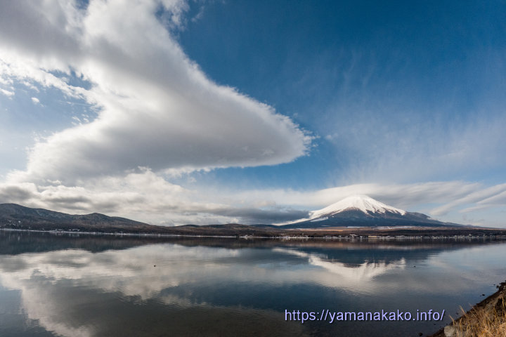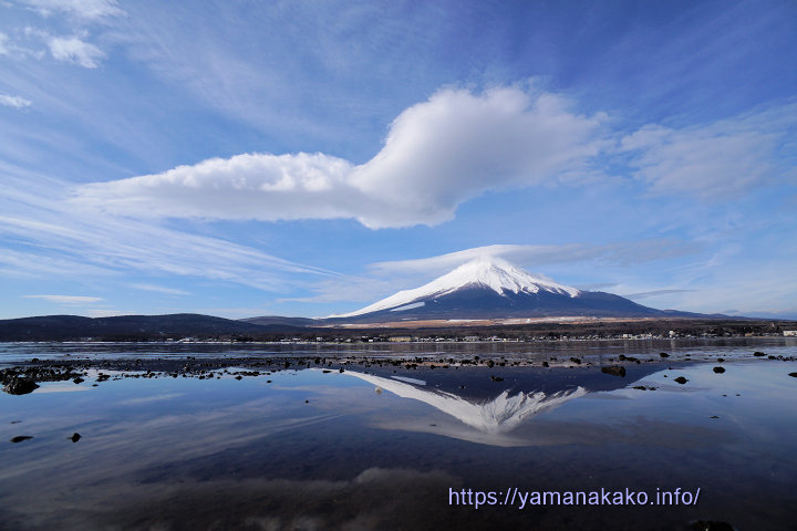 吊るし雲と笠雲今日は朝から富士山には笠雲がかかっていて、刻々と変化していてなかなかいい感じでした。8時過ぎぐらいから吊るし雲も発生し、9時頃には写真のように見られたので、逆さ富士ポイントから撮ってみました。