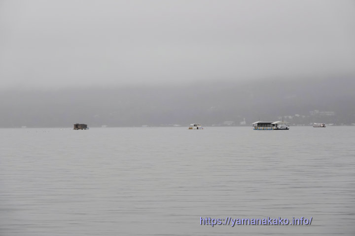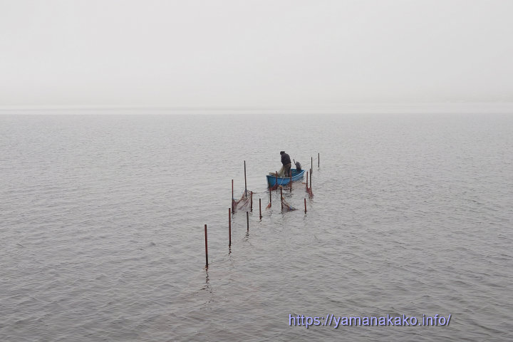 雨に煙る山中湖今朝の山中湖は雨に煙り対岸が見えない状況ですが、わかさぎの定置網漁が行われていました。例年だとこの時期はまだあまり捕れないのですが、今年は型がよく量も多く捕れているようです。
