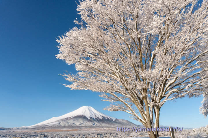 真っ白になった木と富士山昨日降った雪が木々に着雪し、花が咲いたようになり、朝日に照らされてキラキラととてもきれいでした。ただこの美しさは儚く、風が吹くとすぐ散ってしまい、10時頃にはほとんど残っていませんでした。