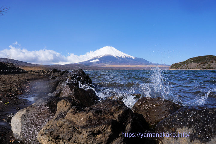 波しぶきと富士山今日は風が強めで平野湖畔では、石に打ち寄せる波しぶきが見られました。早朝は雲が出ていてすっきりとは見えなかった富士山ですが、風で空気が澄んできたようで9時頃はきれいに見えました。