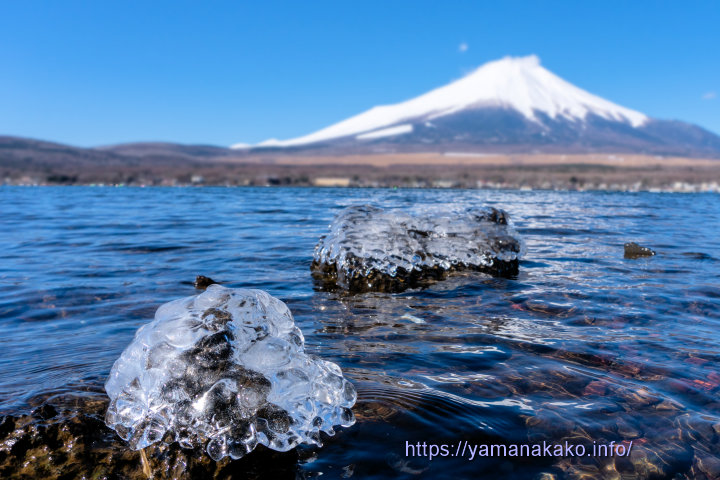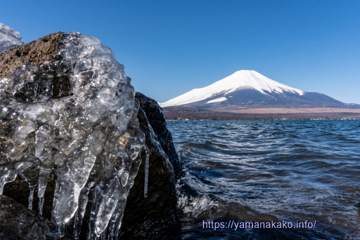 つららと富士山18日に投稿した場所辺りでは、ここのところの気温低下と強風により、真冬のように石が氷でコーティングされて、つららも見られました。今日で3回連続の湖畔の氷ネタですが、明日からは気温が上がるようなので、今日の投稿で今シーズンは終了かと思います。