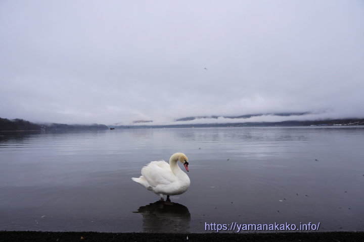 1羽の白鳥昨日から雨が降ったりやんだりで、富士山は見えません。ちょうど雨がやんだとき、湖畔に1羽だけ白鳥がいたのでモデルになってもらいました。このときは風もなく湖も穏やかでした。