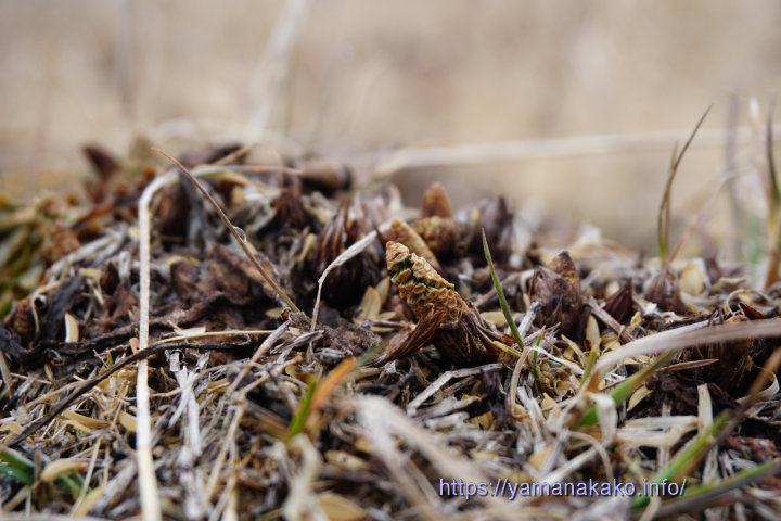 つくしの芽昨年の今頃はここにツクシが並んでいて、遠目に見てもツクシとわかるような状況でしたが、今年はまだ芽が出たばかりで、やっと見つけられる程度です。昨年の3月14日の様子よりも小さく、3週間以上遅いような感じです。