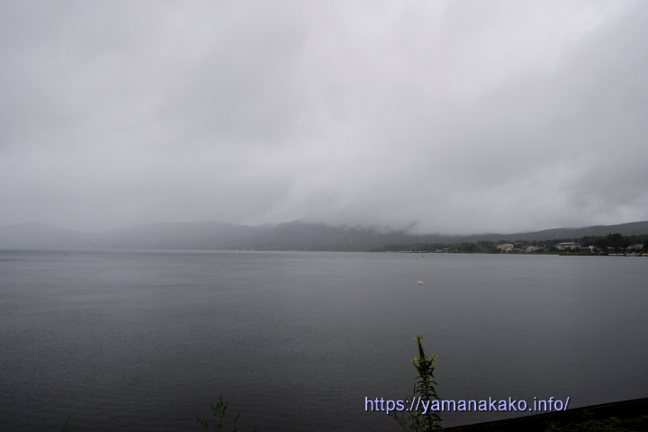 人影がなく風もない穏やかな山中湖 昨日まではお盆期間中で混雑していた山中湖ですが、今朝は台風接近情報により、湖に浮かんでいるボートはなく、風もないので穏やかな湖となっています。今のところ雨は降っていますが、台風の影響は感じられませんので、このまま静かな1日となってもらいたいものです。