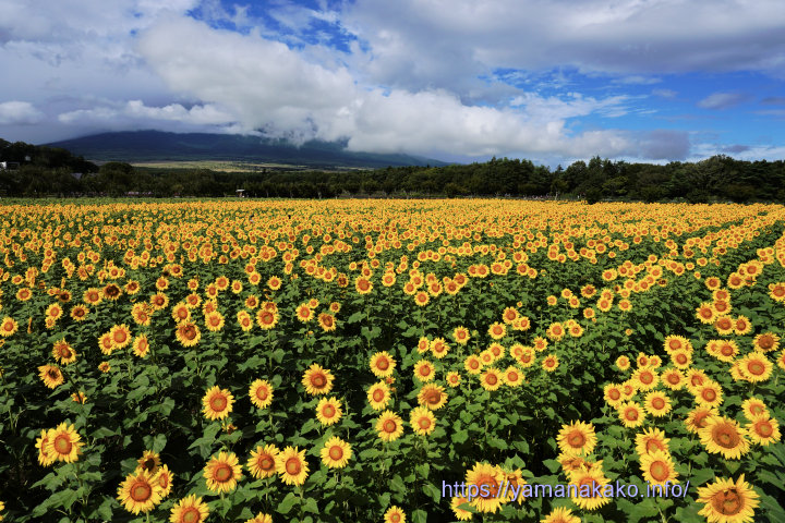 花の都公園のひまわり 8月6日投稿のひまわり はもう見頃を過ぎて、今朝はその畑を耕していましたが、その隣の畑では写真のように満開となっています。で、相変わらず富士山は雲の中、さて満開の内に富士山が見られるでしょうか。