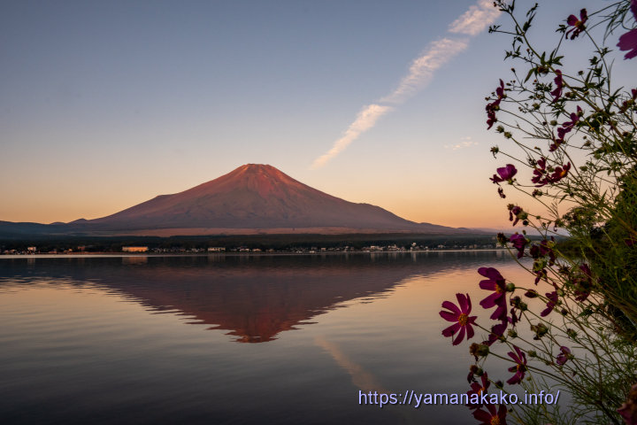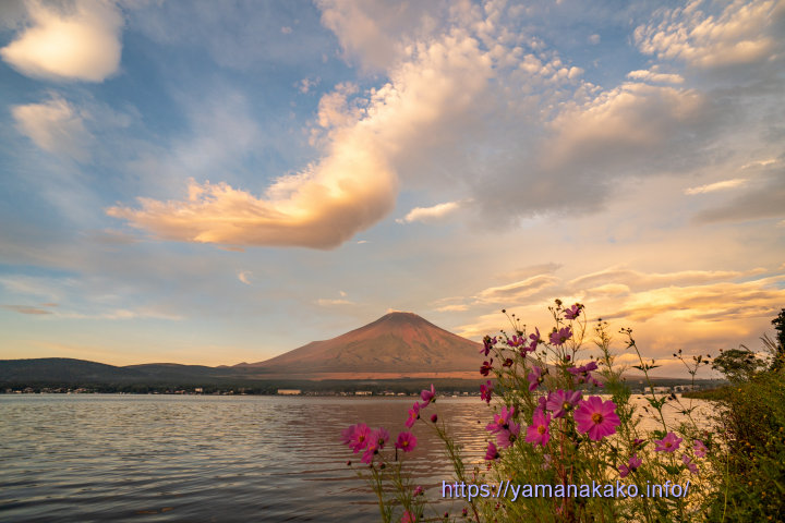 湖畔に咲くコスモス今朝は朝焼けがきれいで、雲が赤く染まった後は、富士山も赤くなり、湖畔に咲くコスモスと吊るし雲もなかなかいい感じの朝でした。