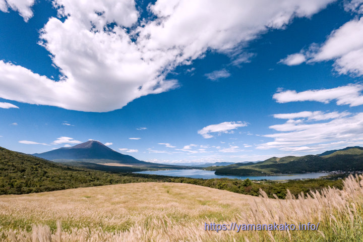 富士山と山中湖今日は青空に白い雲が映えていたので、三国峠から山中湖と富士山と一緒に撮ってみました。ススキの穂が出てがちょうどいい感じになっているのでおすすめです。パノラマ台は工事中で駐車できませんが、少し上ると駐車スペースがあるので、そちらをご利用ください。