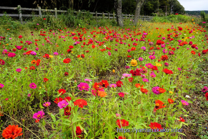 湖畔に咲く百日草湖畔に咲くコスモスは何度か投稿してきましたが、長池湖畔で他にも百日草やオレンジフレアが咲いています。以前投稿した場所とは違い、こちらは花畑となっていてたくさん咲いていますが、先日来の風雨でだいぶ痛んでしまったようです。
