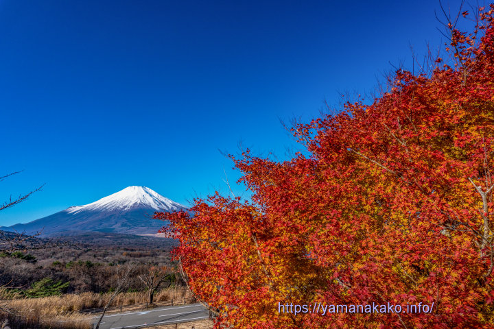 パノラマ台から紅葉と富士山パノラマ台展望デッキが一般開放されて1週間以上が経過し、連日多くの人が訪れていますが、駐車場が狭くあまり車は駐められませんのでご注意ください。駐車場から明神山山頂方面を見ると、まだ真っ赤に染まったモミジが残っていたので、少し上の方から撮ってみました。そろそろ紅葉ネタも終わりかな(汗)