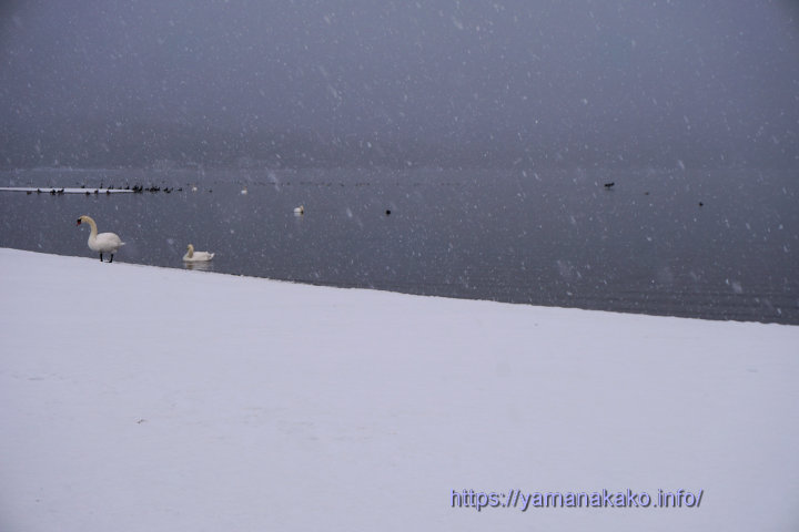 雪景色の平野湖畔天気予報は曇りだったので、雪が降ってもちらつく程度かと思っていましたが、意外と多く2〜3cmほどの積雪なり、道路も白くなっていました。これからの季節、思いがけず雪が降ることもあるので、山中湖を始め富士五湖方面に車で来られる方は、スタッドレスタイヤ等装着(準備)して来てください。