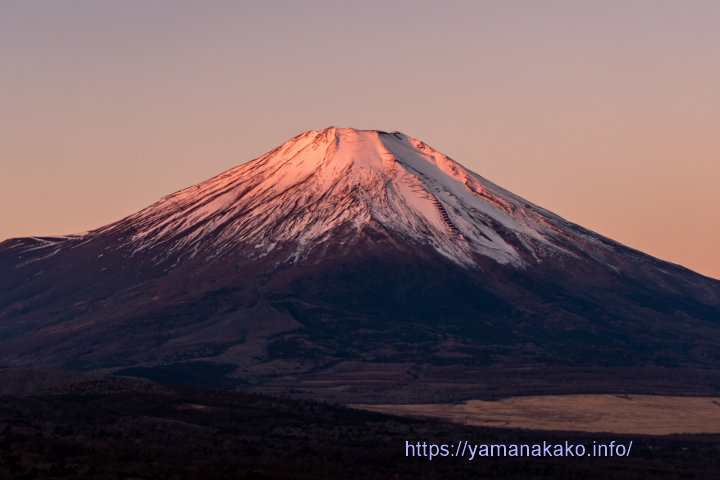 パノラマ台から紅富士今朝は富士山の雪がほんのり紅く染まり、紅富士となりました。19日にほんの少し雪が降った以外は、その前からずっと晴天が続いていて、富士山の雪も日に日に少なくなっているように見えます。11月25日はかなり白く、このまま冬の富士山になるかと思いましたが、また秋の富士山に戻ってしまいそうです。