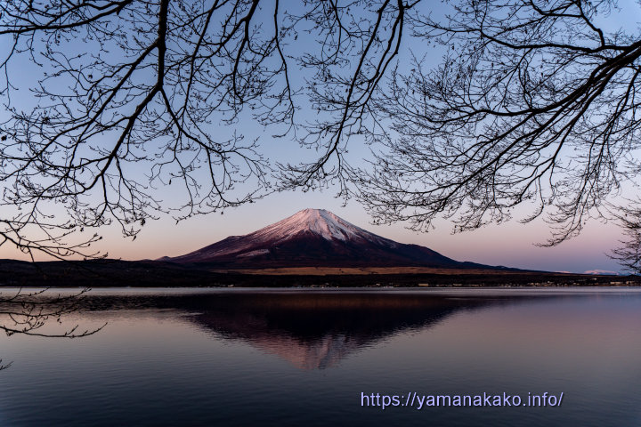 朝の富士山今日は朝からすっきりと晴れていたので、紅富士になるかと期待しましたが、こんな感じで終わってしまいました。この場所は湖に枝が張りだしていますが、だんだんと伸びてきたので、雪が降ったら折れてしまうかもしれません。