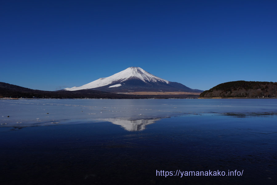まだ氷のある平野湖畔から平野地区の多くを覆っていた氷はだんだんと少なくなり、岸側は氷がなくなっているところが多くあり、そこに逆さ富士が見られるんですが、今朝は風が強くいまいちでした。一時期より氷もだいぶ薄くなっていますので、氷上立入禁止は継続中です。