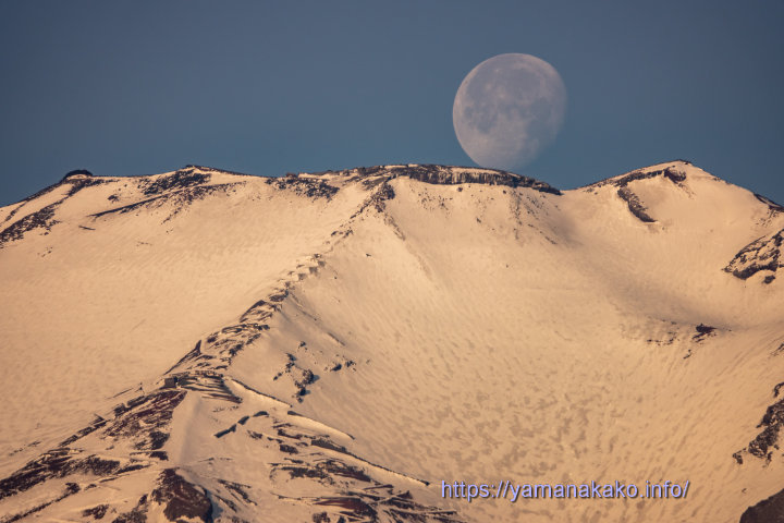 富士山頂に沈む月今朝も富士山頂に沈む月が見られましたが、昨日より1時間ほど遅い時間だったので、かなり明るくなってからで月が目立ちませんでした。今日も撮る場所が少しずれていたので、ほぼ昨日と同じような位置に沈みました。来月は真ん中に沈む月を撮りたいものです。