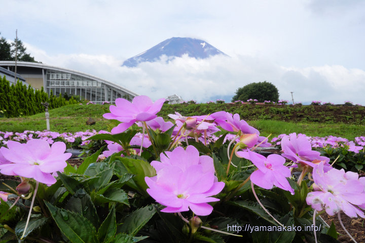 サンパチェンスと富士山花の都公園内を散歩していたら、ほんの短い時間ですが、富士山山頂が見えました、ここのところ曇りや雨の日が多く、気温が低い日もあり夏らしくありませんが、いつの間にか夏仕様の雪のない富士山になっていました。