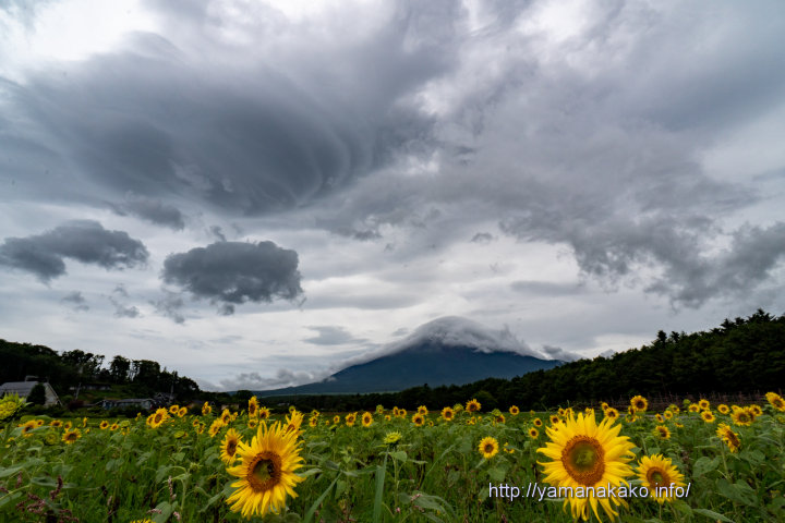 花の都公園ひまわり畑より今日も富士山には吊るし雲と笠雲がかかっていたので、ひまわりが咲き始めた花の都公園より狙ってみましたが、低空の雲が邪魔でよくわかりませんでした。