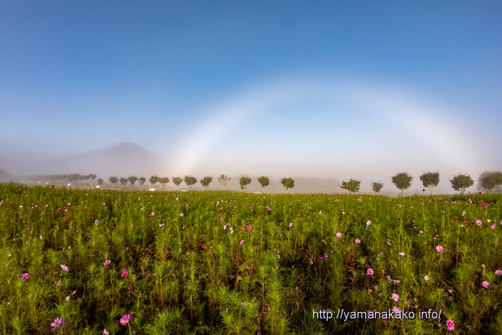 白虹(白い虹)今朝は冷え込んだので、湖では毛嵐が出ていて、対岸が見えないほどでいい感じだったので、日が少し高くなってから、花の都公園に行ってみました。桂川からも水蒸気が上がり、花の都公園はもやに包まれていましたが、そのもやが晴れる時に、白虹(白い虹)が見られました。富士山を入れて撮りたかったのですが、これが精一杯でした。