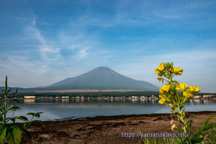 大待宵草と富士山今年も長池湖畔ではたくさんの大待宵草が咲いています。例年だとこの花が咲いているところが、湖畔ギリギリですが、今年は湖水量が近年にないほど少なく、湖畔が広くなっています。