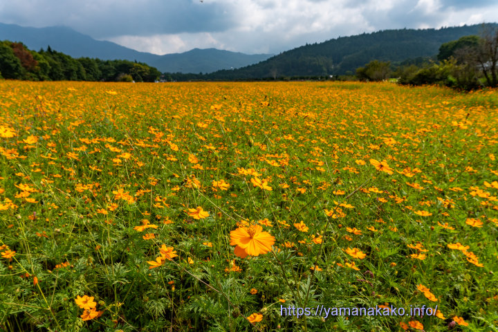 見事なったオレンジフレア先日より紹介している花の都公園のコスモスや百日草の他に、写真のオレンジフレア(キバナコスモス)が見頃となり、広範囲で咲いているので辺り一面オレンジ色となっています。