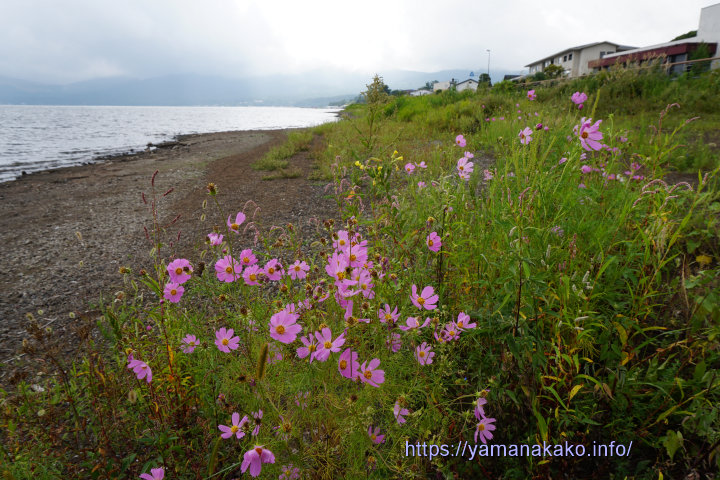 自生のコスモス湖畔の所々にコスモスが咲いています。咲いている様子から種が湖岸に流れ着いて育ったようにみられ、他にクレオメが咲いているのも見かけます。以前はひまわりが咲いているときもありましたが、今年は見つけられませんでした。