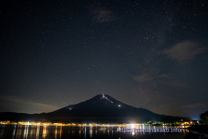 富士山の山小屋の灯り今日も夜明け前から早朝はきれいな富士山が見られましたが、7時頃からは雲が湧き出てきて、山頂は雲の中に隠れて見えなくなってしまいました。写真のように夜は山小屋の灯りも見られます。