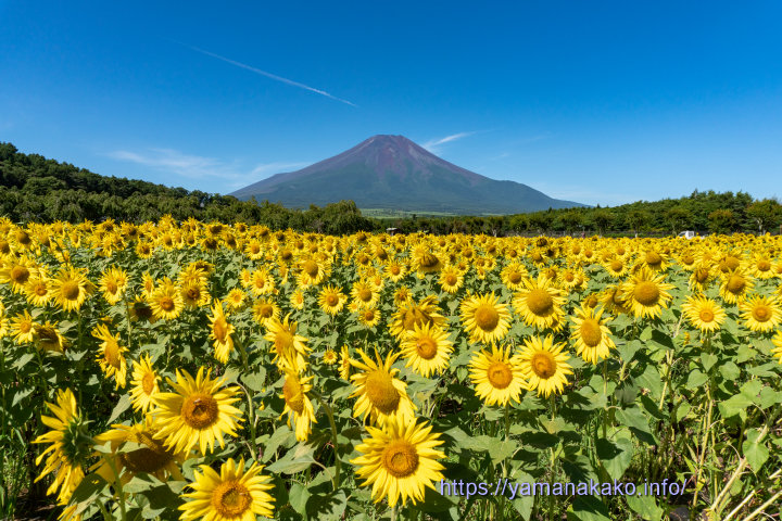 花の都公園のひまわり花の都公園の営業時間にすっきりとした富士山が見られたので、ひまわり畑から富士山を撮ってみました(写真)。ここのひまわりは終盤となり、下を向き始めていましたが、清流の里の端にあるひまわり畑はもう少しで満開となるところで、複数の種類のひまわりが見られます。