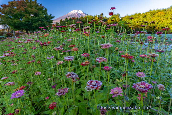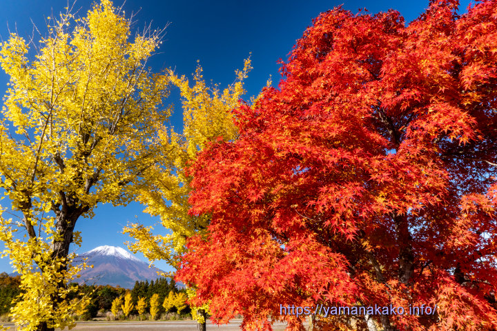 山中地区湖畔の木々山中地区湖畔に植えられているもみじやヤマボウシなどの木々が赤く色付いてきて、赤や黄色に染まり、緑もまだ残っていてきれいです。山中湖全体的には紅葉はまだまだこれからですが、こんな風にきれいに色付いている木もあるので、今週末の紅葉まつりが始まる頃にはもっときれいになると思います。