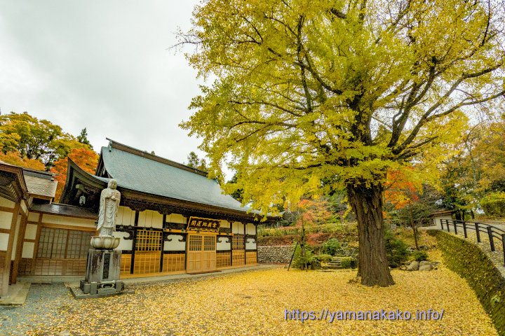 寿徳寺の大銀杏世界的オペラ歌手だった三浦環が眠る寿徳寺にある大イチョウの黄葉がピークを迎え、黄色い落ち葉の絨毯ができています。だいぶ葉が落ちてきましたが、まだ枝にもたくさんの葉が残っていてとてもきれいです。晴れていたらもっときれいかと思います。