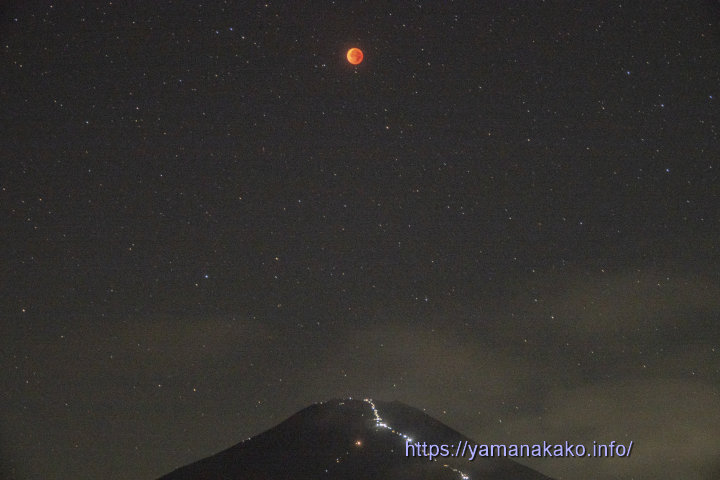 富士山の上で皆既月食今朝の2時30分頃から皆既月食が始まり3時50分頃まで、赤銅色の月が見られ、ままの森の下では3時25分頃に富士山の上に見ることができました。前述のような時間にもかかわらず、天候にも恵まれたので山中湖周辺には夕方から多くの人が訪れ、長池親水公園やパノラマ台などは早々に駐車場がいっぱいになってしまい、元旦と同じような混雑ぶりでした。