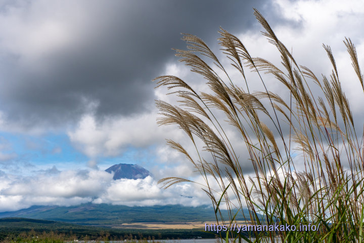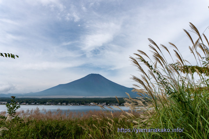 湖畔のススキと富士山早朝は山頂付近に雲がかかっていましたが、9時頃にはその雲がとれて、山頂までよく見えましたが、上空には薄い雲が出ていて日差しもありません。