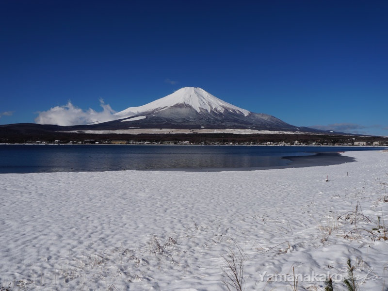 まとまった雪が降って、富士山は白さが増し湖畔も真っ白になりました