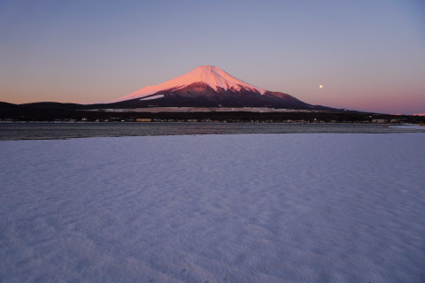 5日は久しぶりに朝からいい天気になって、紅く染まった富士山を見ることができました。空には月が残り、湖畔にはまだ多くの雪が残っていて、なかなかいい感じでした。