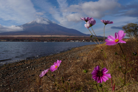 湖畔に咲くコスモス