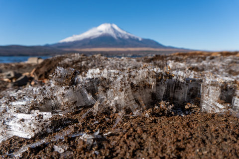 4日の朝は、寒波襲来により、氷点下7.8度まで下がり、湖畔には写真のような霜柱ができていました。