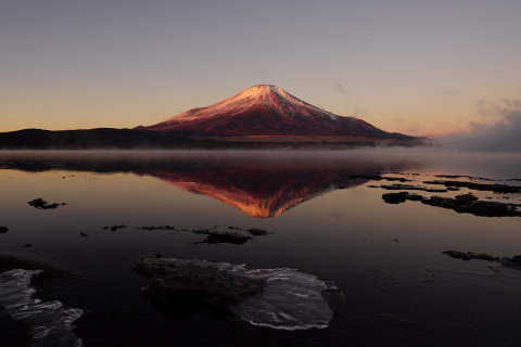 5日は前日よりさらに冷え込み、湖畔では薄氷が張って、きれいな紅富士の逆さ富士が見られました。