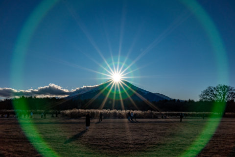 15日はいい天気で空気も澄んでいたので、きれいなダイヤモンド富士が見られました。この写真を撮影したカメラだと、太陽を中央に入れると緑色のカメラゴーストが入ります。いつもは気にして撮っていますが、たまにはそのままの様子もいいかも(笑)。