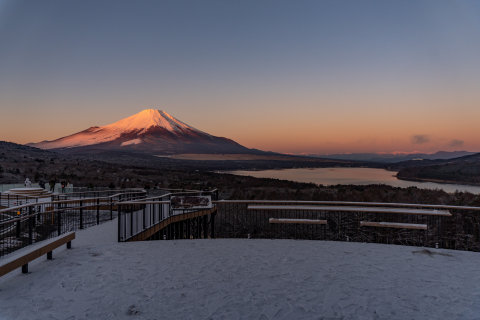 22日の晩に湖畔辺りでは小雨が降りましたが、標高の高いパノラマ台では雪だったようで、23日の朝は写真のように真っ白になって1cmほどの積雪となっていました。