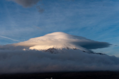 25日は雲に遮られて富士山の全景は見られませんでしたが、雲が途切れたときには、立派な笠雲を被った富士山が見られました。この日の午後からは雨模様となりました。